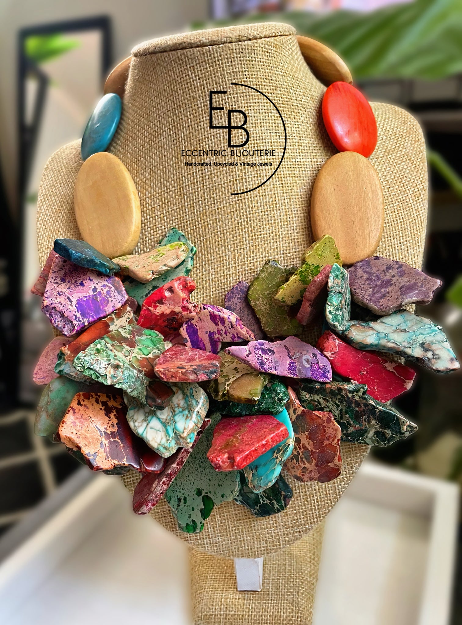 The "Jasper Woods" Statement Necklace features stunning Jasper slices and gaudy wood and resin beads, creating a vibrant and unique look. With a length of approximately 14 inches and a chic lobster claw closure, this necklace is versatile and perfect for elevating any outfit.