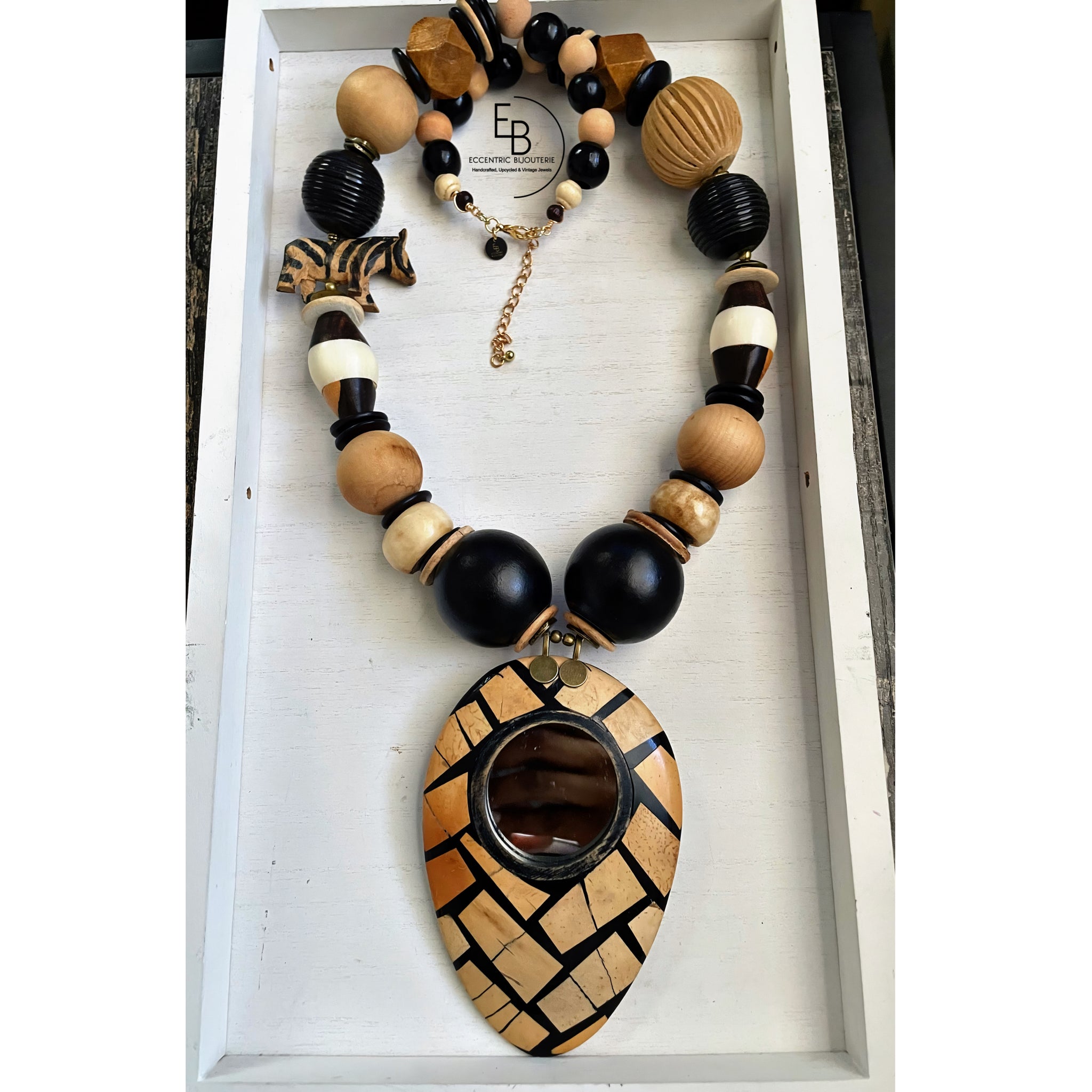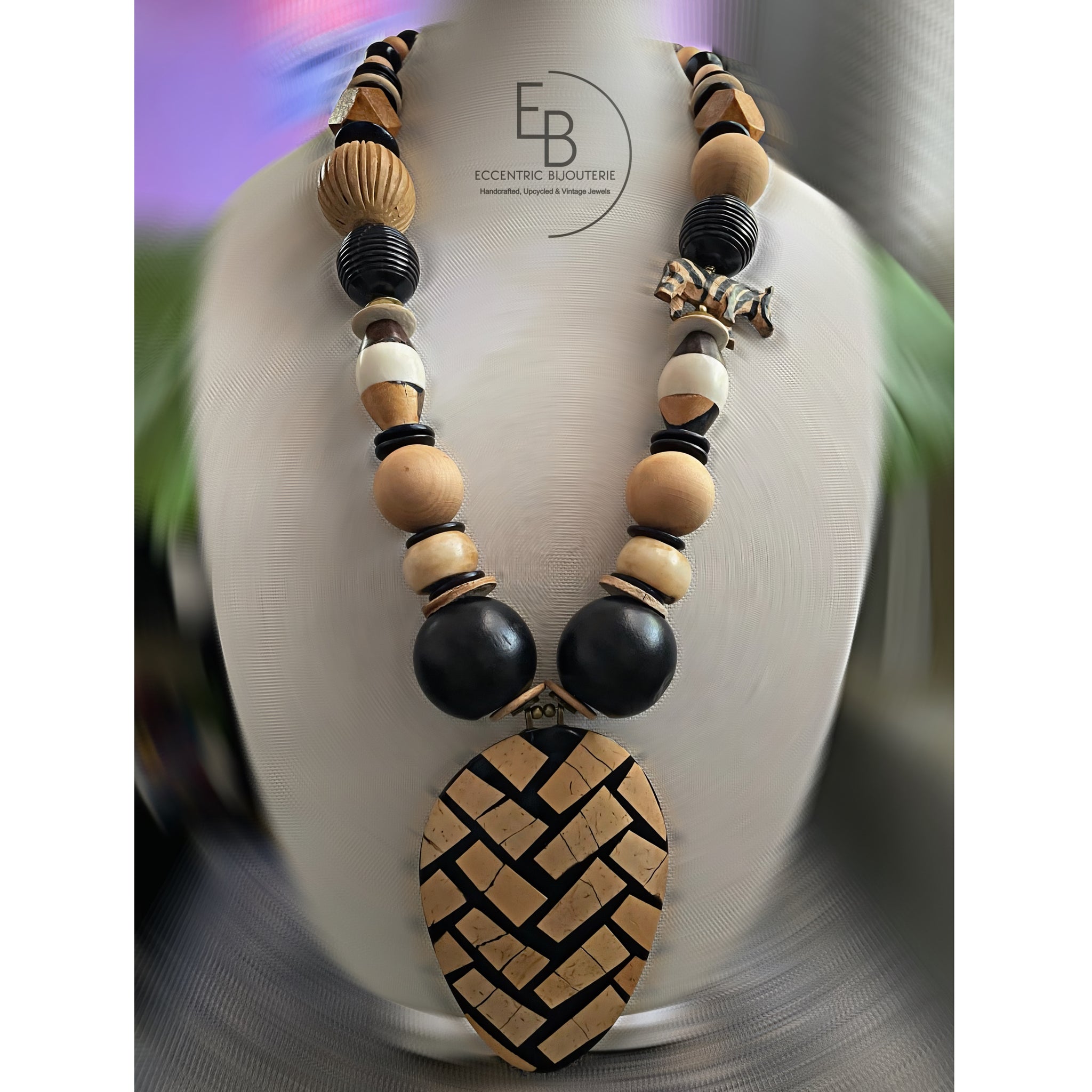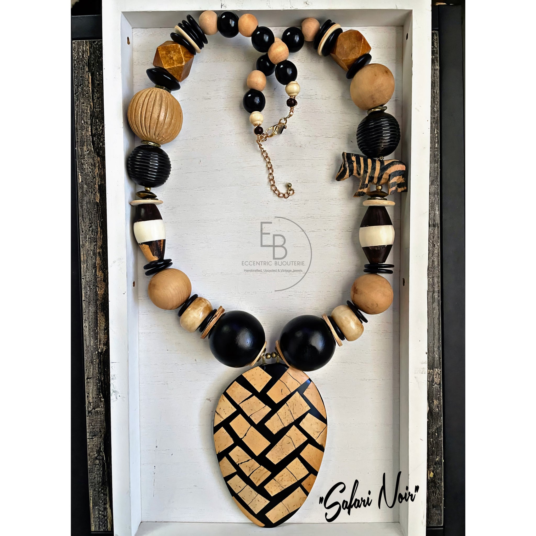 “Safari Noir” Vintage Wood & Bone Bead Abstract Necklace