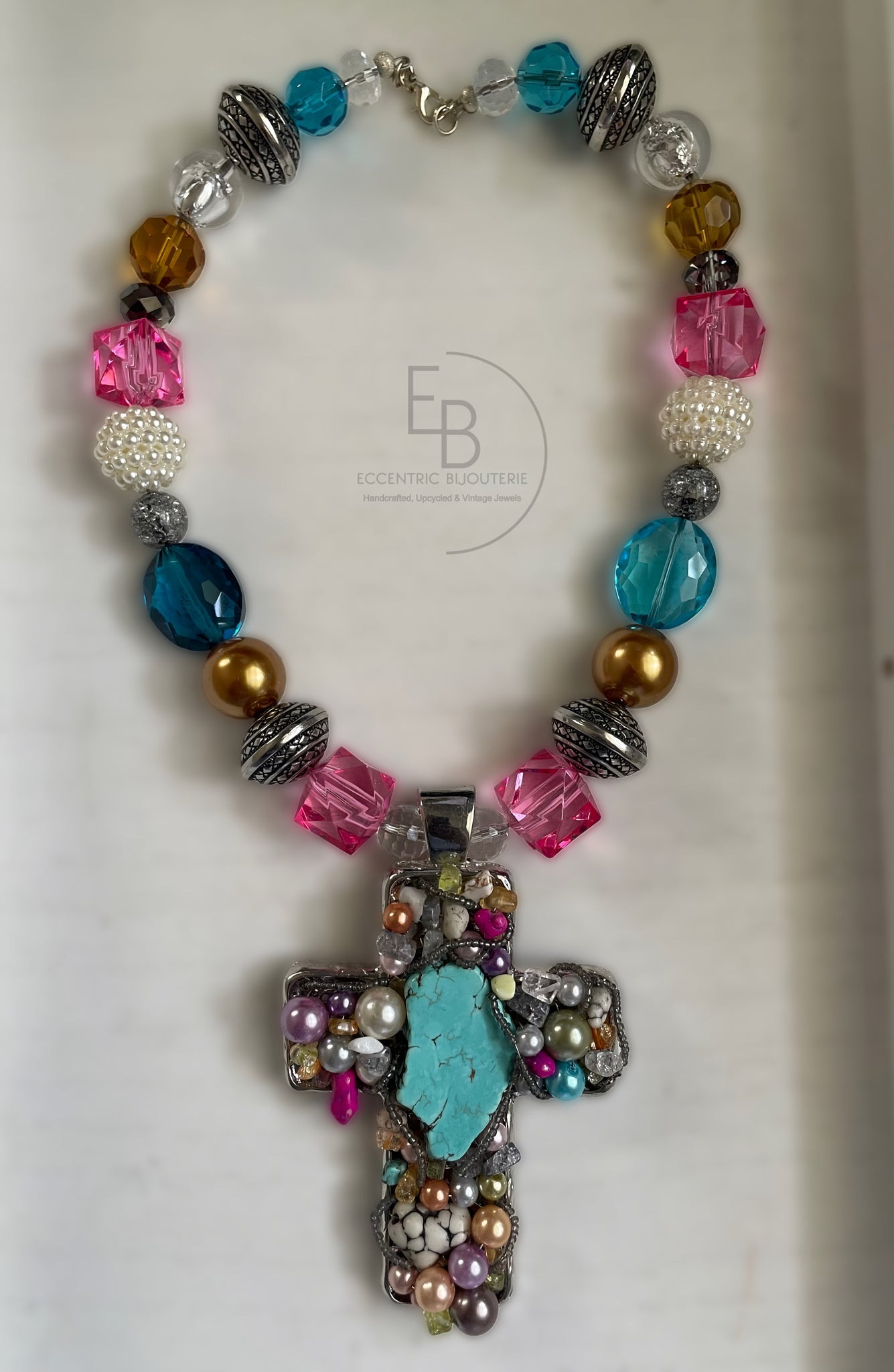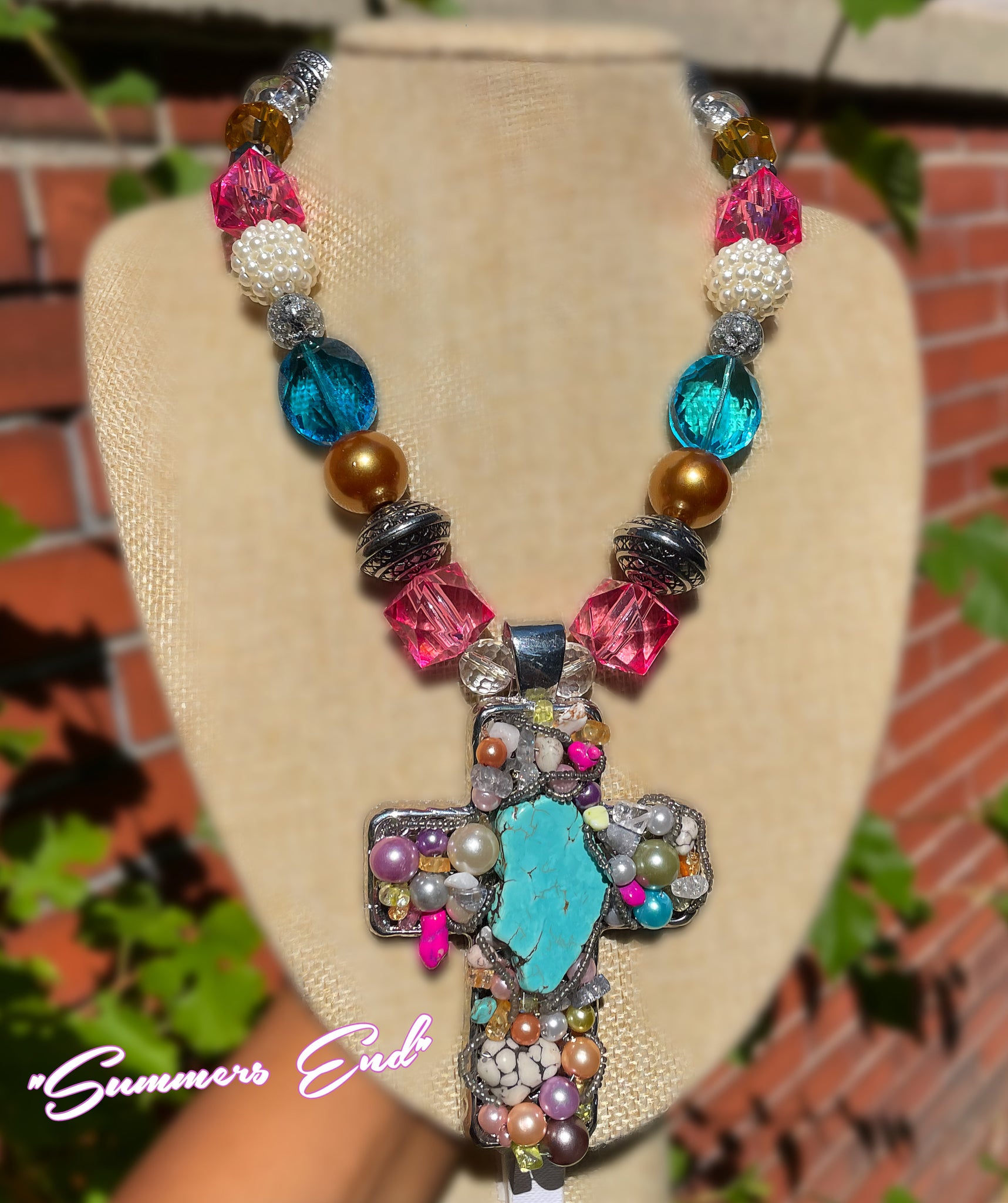 Experience the beauty of summer's end with our handcrafted "Summers End" necklace. Made with faceted resin beads in a soft pastel palette, it features a stunning weighted cross pendant adorned with wired gemstones and mixed bead chips. A truly beautiful addition to your collection.