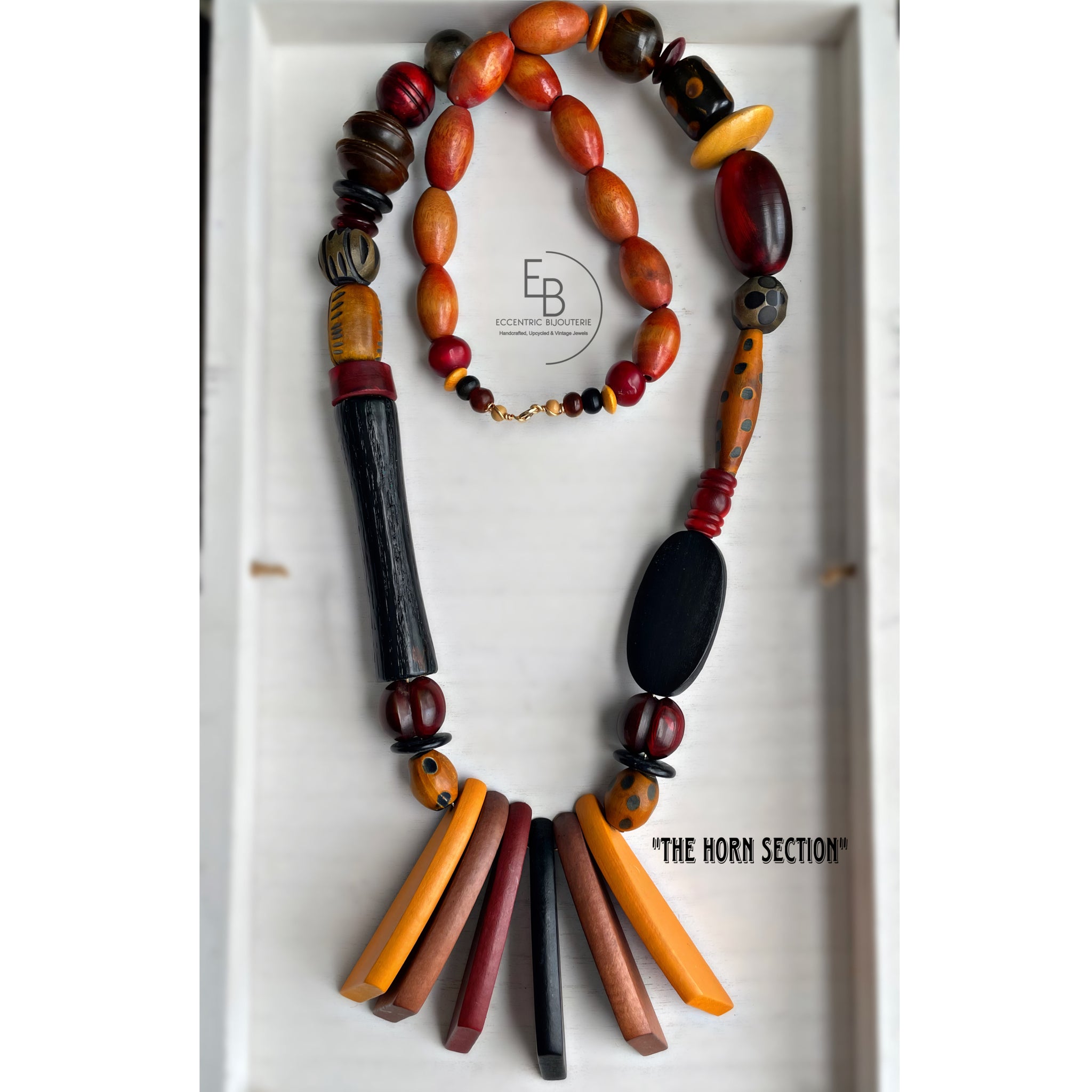 Indulge in pure luxury with "The Horn Section" necklace. This handcrafted masterpiece features exquisite horn beads intertwined with hand painted and batik-style wooden beads. With an 18-inch length and gold plated closure, this unique piece is the epitome of chic style. Elevate your style with this one-of-a-kind necklace.