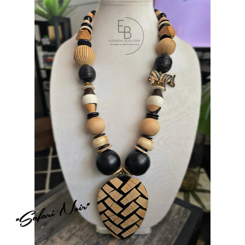 “Safari Noir” Vintage Wood & Bone Bead Abstract Necklace